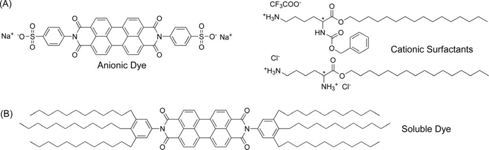 (A) Charged perylene bisimide and surfactants. (B) Perylene bisimide with alkyl tails.