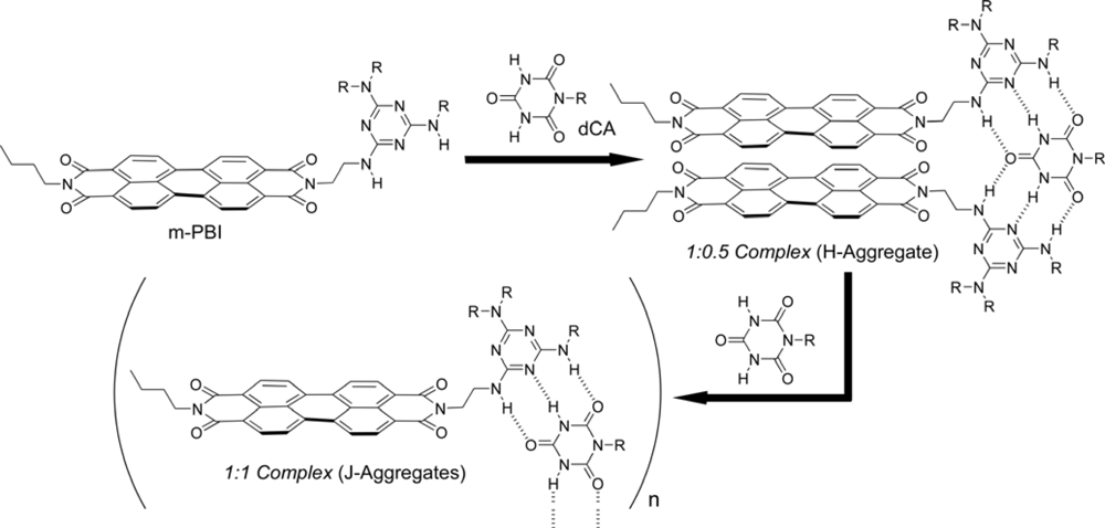 The local π-stacking arrangements of the chromophores greatly affect the dye’s optical and electronic properties. For instance, H-aggregated PBIs exhibit the high n-type carrier mobilities desired in electronic devices [], the extended exciton mobility of J-aggregated PBIs could be exploited in organic solar cells. However, to date, soluble J-aggregates of core-unsubstituted PBIs with a drastic red shift of the absorption spectra are not known, despite the fact that such aggregates would certainly expand the scope of PBIs as functional materials. Yagai, Würthner and co-workers have serendipitously discovered an unprecedented phenomenon, the transformation from H-to J-aggregated perylene bisimides by using hydrogen-bond directed complexation between melamine-functionalized PBI (m-PBI) and cyanurate []. The H-aggregate was successfully prepared by the formation of a new supramolecular architecture consisting of ditopic cyanurate dCA and monotopic m-PBI in 1:0.5 stoichiometry (Figure 3). Further addition of dCA to the solution of m-PBI/dCA = 1:0.5 mixture, the resulting J-aggregates exhibits a remarkable red-shifted absorption band (> 100 nm), which is unprecedented for soluble core-unsubstituted perylene bisimides. Another intriguing feature of this system is the self-organization into an extended structure. When 1:1 mixtures in methylcyclohexane were kept at room temperature, a green precipitate was formed within several hours in almost quantitative yield. A striking change in absorption wavelength and the feature of spontaneous formation of a supramolecular network leads to the generation of a “green pigment” from perylene bisimide without introduction of substituents in the bay position. In the solid state as well as in solution, it has also been demonstrated that the mutual transformation between H- and J-type chromophore packing can be achieved by controlling the temperature. Based on these new findings, the construction of further functional supramolecular systems can be approached from core-unsubstituted perylene bisimides, which show optical and electronic properties that can be changed by external inputs.