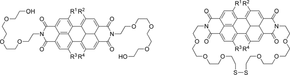 In order to understand dynamic self-assembly processes of molecular codes, Li and coworkers have investigated the perylene bisimides (PBIs) monomers (Figure 4) and their conjugates []. They have examined dynamic self-assembly between bay-substituted PBI monomers by UV/Vis and NMR spectroscopy. Monomers with different twist angles preferentially self-assemble into segregated nanostructures even in the presence of other twisted units, thus revealing their unique molecular encryption. Furthermore, to check code specificity, they compared the concentration-dependent NMR studies in a heterogeneous equimolar mixture of the monomers to those of the individual homogeneous solutions. Interestingly, the mixture self-organizes so that the monomers with different twist angles selectively self-assemble with identical species, and very little cross-assembly apparently occurs. Therefore, monomer molecular shapes act as selective molecular codes that control self-organization. To prove the molecular code concept, they employed a 1:1 heterogeneous reaction mixture of compounds, which have identical reactive functional groups and can undergo the same disulfide bond formation. If the reaction pathway was not driven by a molecular code, the reaction products would contain an indistinguishable statistical mixture of two building blocks. As expected, only the homoreaction polymer bound products, also formed in the separate homogeneous reactions, could be isolated; no cross-assembled product such as the heterogeneous ring compound was detected. These results show that a new hypothesis emerges: matching molecular size, shape, and charge produces synergistic weak intermolecular attractive forces, which impart molecular codes; such molecular codes effectively control chemical reaction pathways and products.