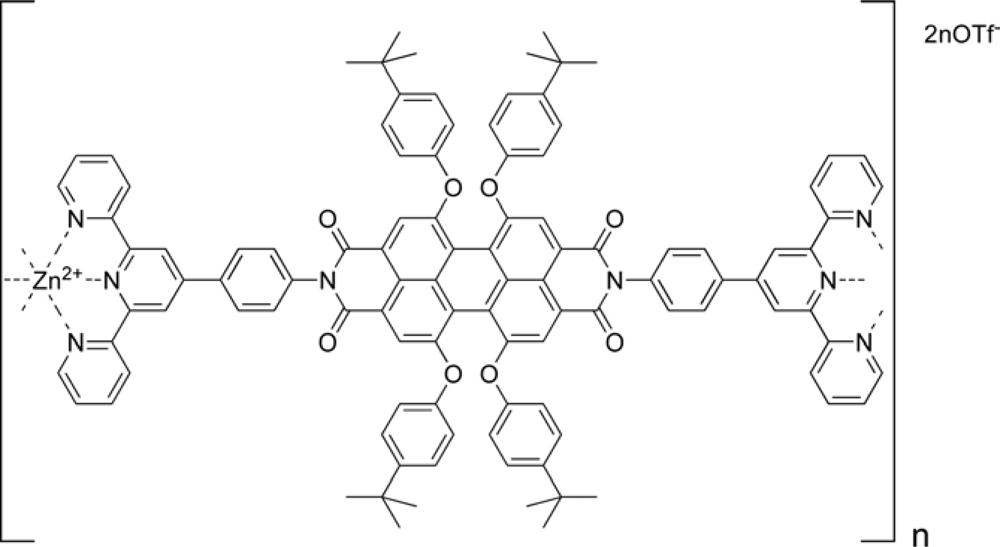 Photoactive organic compounds have received much attention in the past decade as materials for organic light emitting diodes (OLEDs) and plastic solar cells. For both applications, photoactive polymers, as well as size-defined functional molecules, have been successfully developed []. In most cases, device fabrication involves either the spin-coating of soluble polymers or the vacuum deposition of thin films of functional molecules. Although both methods are well-established, they have certain disadvantages. Functionalized polymers are difficult to purify after the polymerization step, and defective linkages which disrupt the conjugation cannot always be avoided. Therefore, sophisticated soluble precursor polymers are necessary to overcome the obstacles. Metal-ligand coordination seems to be a good candidate for this goal. Although a large number of coordination polymer structures have been reported, only few examples are known where functional units such as dyes have been incorporated into supramolecular coordination polymers. Würthner and co-workers have investigated the complexation behavior of 2,2′:6′,2″ -terpyridine derivatives with Zn2+ ions, and metallo-supramolecular self-assembly of functional perylene bisimide dyes to polymeric structures (Figure 6)[]. On the basis of the results, by Zn2+ complexation of monotopic and ditopic building blocks, dimer complexes and highly soluble coordination polymers have been prepared, respectively. For both dimer and polymer, reversible coordination was observed depending on the ratio of Zn2+/ligand, resulting for the polymer in a drastically decreased chain length when the Zn2+/ligand ratio exceeds 1:1. Fluorescence properties of the coordination compounds are excellent with high fluorescence quantum yields also for the polymeric compounds. The hypothesis of reversible self-assembly and de-assembly of a high-molecular-weight coordination polymer at Zn2+ excess was supported by the results of DOSY NMR and fluorescence anisotropy measurements. Both methods are sensitive to the diffusion coefficients of the analyte and resulted in a significantly decreased diffusion coefficient for the polymer compound in comparison to the ligand and the fragments obtained by exceeding a 1:1 ratio. Visualization of the coordination polymer was possible by AFM microscopy, and the average chain length was determined to 15 units, which is in agreement with the value of > 10 units obtained from 1H NMR. AFM also revealed the formation of a homogeneous monolayer on negatively charged substrates. This observation and preliminary results render this self-assembled functional system as an interesting alternative to traditional main chain perylene bisimide polymers for application in artificial light harvesting systems or organic light emitting diode fabrication.