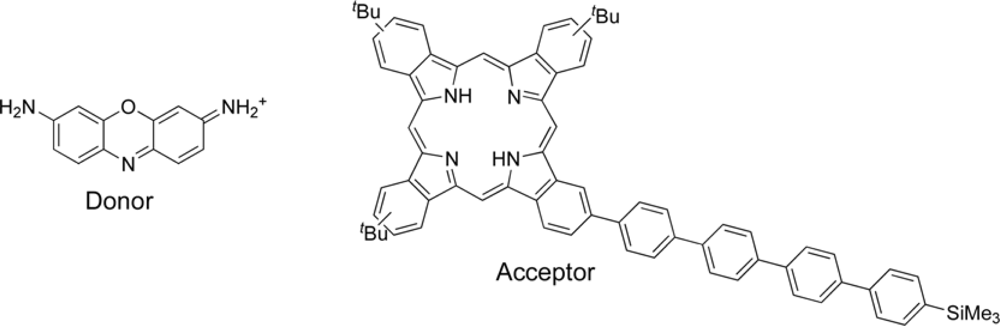 One dimensional channel materials are very fascinating hosts for supramolecular organization of guests species, because they are the simplest possible choice for obtaining a specific organizational pattern. Zeolite L has been shown to be a good host for the realization of such systems []. The size and aspect ratio of the cylindrically shaped zeolite crystals can be tuned over a wide range, adding to the extensibility of this host material. Due to the geometric constraints imposed by the one-dimensional channel structure, it is possible to afford materials with very high concentrations of monomeric dyes. In a theoretical study, Calzaferri and co-workers have examined cylinders containing energy transfer donor dye and acceptor dye molecules in such an arrangement []. Upon selective excitation of the donor dyes inside, the energy travels via Förster Resonance Energy Transfer (FRET) to an unexcited neighbor. After a series of steps, the electronic excitation energy reaches a luminescent trap (acceptor molecule) and is then released as fluorescence. Such artificial antenna materials are very interesting in the design of sensitized organic solar cells or fluorescent concentrators []. On the basis of this concept, Calzaferri, Brühwiler, Torres and co-workers have designed and prepared an artificial photonic antenna system by incorporating organic dyes into zeolite L []. The donor dye, shown in Figure 7, has been chosen since it has often been used for synthesizing energy transfer materials. As for the acceptor molecule, they used a stopcock shaped phthalocyanine for plugging the channel entrances of zeolite L. The donor dye was inserted into zeolite L by ion exchange from H2O. For the adsorption of the phthalocyanine to the channel end, an adsorption procedure from a hexane-dichloromethane suspension was suitable for the attachment of the phthalocyanine to zeolite L. UV/vis and PL spectroscopic studies show considerable energy transfer from the dye to the phthalocyanine. The combination of channel entrance functionalized zeolite L with the phthalocyanine derivatives bearing a reactive tail end group is expected to lead to more robust materials for optoelectronic applications.