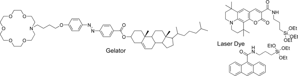 The fabrication of one-dimensional nanostructures has generated a great deal of attention in nanotechnology, because they have attractive geometries and physical properties, and numerous potential applications. Among the one-dimensional materials, silica nanotubes (SNTs) can be applied to the areas of catalysis, bioseparation, optical sensors, and nanoscale electronic devices. In the case of the organic-crystal-assisted self-assembly method, SNTs were fabricated by the addition of an ammonium hydroxide solution to an ethanol/tetraethyl orthosicate (TEOS)/tartaric acid solution. In addition, Shinkai and co-workers have employed organic gelators to prepare silica nanotubes []. Jang and co-workers reported silica nanotubes with novel photoluminescence (PL) characteristics which were synthesized by a sol-gel synthesis in a reverse-microemulsion system []. Also, Jung and co-workers have prepared novel silica nanotubes loaded with fluorescent dyes via cocondensation of modified triethoxysilyl anchor groups and TEOS in a cholesterol-based organogel system (Figure 8) []. They have prepared luminescent silica nanotubes (loaded with a coumarin laser dye and an anthracene laser dye) by sol-gel cocondensation of functional dyes and TEOS in a cholesterol-based organogel system. The emission colors of silica nanotubes can be tuned by using different functional dyes. Interestingly, there is a great difference in PL spectra of silica nanotubes loaded with functional dyes in ethanol solution and the solid state. In ethanol, a green light emission and a bluish green light emission of these dye-containing nanotubes were observed at 486 and 465 nm, respectively, because of the anchoring state between the dye and the nanotube. In the solid state, strong blue light emissions of these dye-containing nanotubes were observed at 482 and 483 nm, respectively. This new preparative procedure enables the utility of tunable nanometer-sized emitters for optical sensors and luminescence diodes.