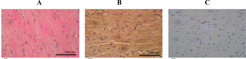HE staining (A) and immunohistochemical staining (B) of the heart from 6 week-old mice with the anti-d-β-Asp-containing peptide 3R antibody. C: Negative control.