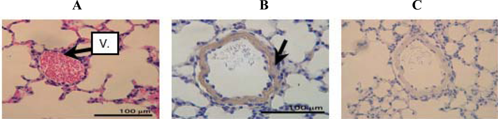 HE staining (A) and immunohistochemical staining (B) of the lung from a 6 week-old mouse with the anti-d-β-Asp-containing peptide 3R antibody. C: Negative control V: blood vessel.