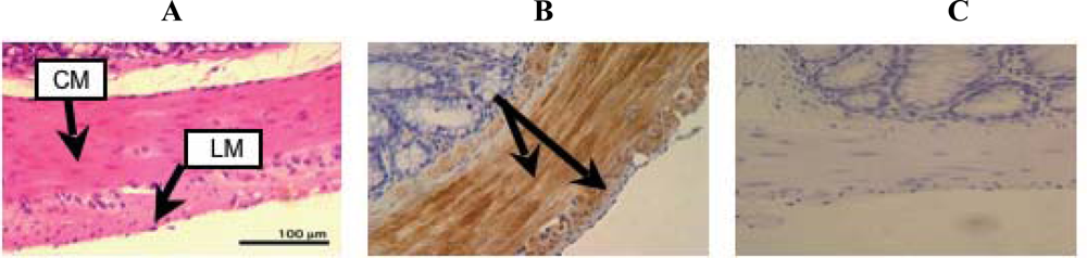 HE staining (A) and immunohistochemical staining (B) of the stomach of a 6 week-old mouse with the anti-d-β-Asp-containing peptide 3R antibody. C: Negative control. CM: circular muscle. LM: longitudinal muscle.