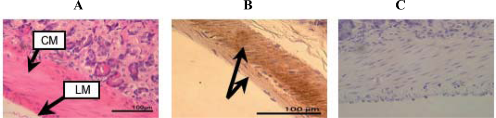 Figures 5A–C represents HE staining and immunohistochemical analysis of stomach tissue from a 6 week-old mouse and the negative control. Strong immunoreactivity to d-β-Asp-containing proteins was seen in the circular and longitudinal muscle (arrows in Figure 5B).