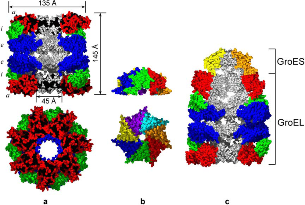 Crystal structures of (a) GroEL chaperonin, (b) co-chaperonin GroES and (c) their complex. To show the inner cavity of GroEL (a) and “Anfinsen’s cage” formed by the GroEL – GroES complex (c) front subunits of each GroEL ring and GroES have been removed. GroEL subunit domains (a-apical, i-intermediate, and e-equatorial) and GroES subunits are shown by different colors. Black color shows exposed hydrophobic residues on the top of apical domains. The figure was plotted using the SwissPdb Viewer [109] and POV-Ray ( www.povray.org) freeware and files 1OEL [20,21] and 1AON [32] which are available in PDB.