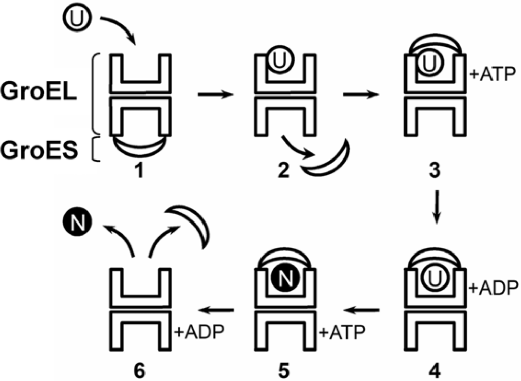 Scheme illustrating the mechanism of GroEL/ES assisted protein folding in the inner cavity (“Anfinsen’s cage”). Non-native (unfolded) and native conformations of protein target are indicated as U and N, respectively.