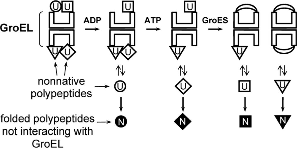 Scheme illustrating the mechanism of GroEL functioning as a molecular chaperone under the assumption of the target protein folding in the free state (in bulk solution) [108]. Different symbols indicate different polypeptides which are bound by GroEL with different association constants. Nonnative (unfolded) and native conformations of polypeptides are indicated as U and N, respectively.