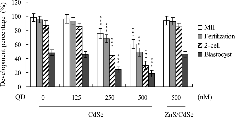 We further analyzed in vitro embryo development to the 2-cell and blastocyst stages. CdSe-core QDs pretreatment during IVM caused an injury effect, as evident from the decreased number of oocytes cleaved to the 2-cell stage (Figure 1). In addition, the number of embryos that cleaved and developed to form blastocysts in the CdSe-core QDs-treated groups were significantly lower than that in the untreated control groups (Figure 1).