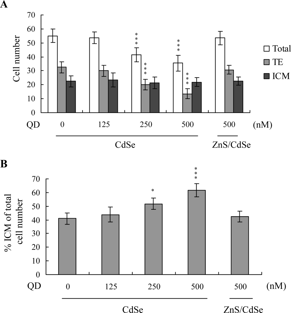 The total blastocyst cell number decreased following CdSe-core QDs treatment during in vitro maturation (IVM) of oocytes. Cell proliferation was assessed by differential staining, followed by cell counting. Significantly lower cell numbers of blastocysts were derived from CdSe-core QDs-pretreated oocytes, compared to those from control oocytes (Figure 2A). The number of trophectoderm (TE) cells in blastocysts also decreased during IVM upon pretreatment with CdSe-core QDs (Figure 2A). However, CdSe-core QDs application during IVM did not affect the number of inner cell mass (ICM) cells present in blastocysts (Figure 2A). The ICM-total cell ratio (expressed as a percentage) was higher in blastocysts derived from the CdSe-core QDs group during IVM, compared with untreated oocytes (Figure 2B).