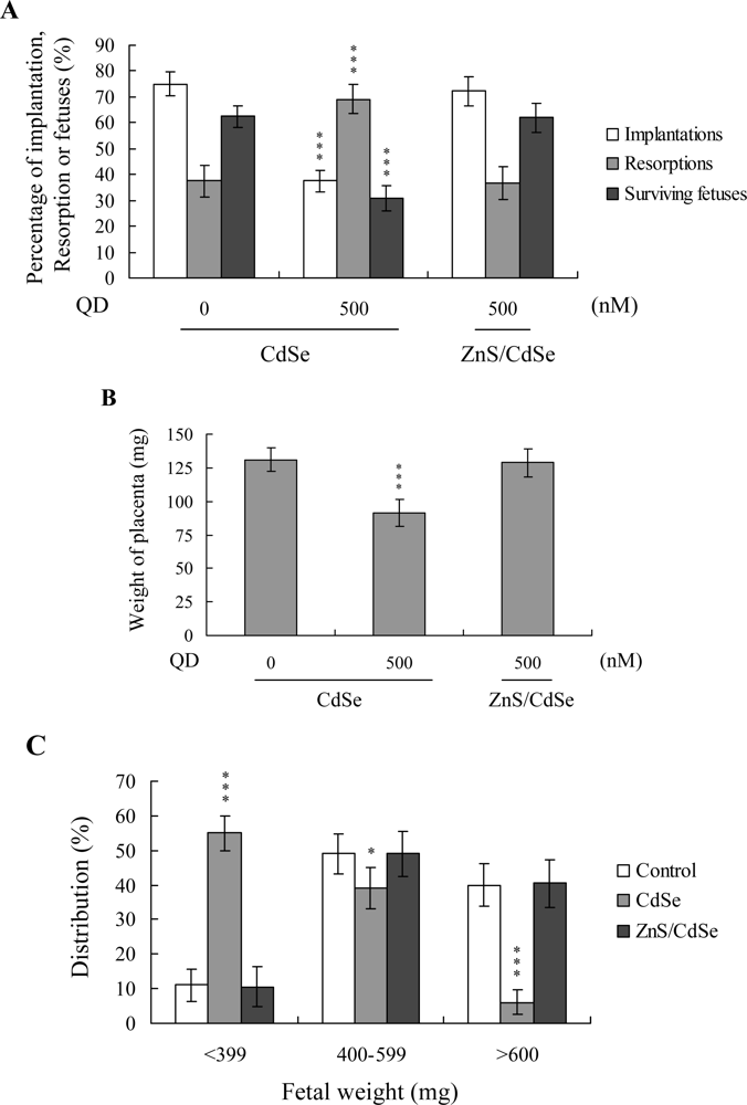 To determine the ability of expanded blastocysts to implant and develop in vivo, embryos generated were transferred to recipient mice. ICR females (6–8 week-old, white skin) were mated with vasectomized males (C57BL/6J; black skin; National Laboratory Animal Center, Taiwan, ROC) to produce pseudopregnant dams as recipients for embryo transfer. To ensure that all fetuses in pseudopregnant mice were derived from embryo transfer (white color) and not fertilization by C57BL/6J (black color), we examined skin color at day 18 post-coitus. To assess the impact of CdSe QDs on postimplantation growth in vivo, COCs were exposed to 0 and 500 nM CdSe-core QDs for 24 h, followed by fertilization and in vitro maturation to the blastocyst stage. Subsequently, eight untreated control embryos were transferred to the left uterine horn, and eight CdSe-core QDs-treated embryos to the right uterine horn in day four pseudopregnant mice. Forty surrogate mice were analyzed and killed on day 18 post-coitus, and the frequency of implantation calculated as the number of implantation sites per number of embryos transferred. The incidence rates of resorbed and surviving fetuses were calculated as number of fetuses per number of implantations, respectively. The weights of the surviving fetuses and placentae were measured immediately after dissection.