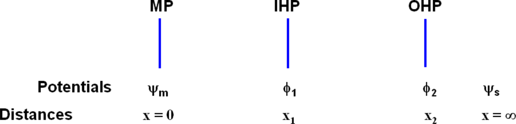 In what follows, the different electrode types must be distinguished. The usual nomenclature [9] defines the: i) ideal polarized electrode, ii) ideal non-polarizable and iii) polarizable electrode; i) refers to an electrode which does not transfer charge between electrode and solution, and in particular the Gouy-Chapman (GC) and Stern modified (GCS) theories of electrodes [9] refer to such systems in the equilibrium (non-dynamical) net zero current regime. In the dynamical regime, when the potential relative to the bulk solution Δψd is varied, the current i must remain zero for this electrode (the i vs Δψd curve is horizontal). Thus the equilibrium situation of the inert electrode is extrapolated to the dynamical regime of a varying Δψd defined by (2) where no electric c urrent flows. By ‘inert’ is meant that there is no net exchange of ions or atoms (except electrons) between solution and electrode. The other extrapolation of behavior refers to ii) when the ‘equilibrium value’ Δψd (when i = 0) of the electrode system does not vary as a current is passed through the electrode-solution interface (the i vs Δψd curve is vertical) ; iii) refers to the intermediate situation, where the departure of the electrode potential from the Nernstian equilibrium value due to the passage of Faradaic current is a measure η of its polarization, written η = E− Δψd′, where E is the measured electrode-solution potential for any current i and Δψd′ the equilibrium e.m.f. relative to a reference electrode. We here also define the iv) self-polarizing electrode, which refers to an electrode which is its own source of the electrode-solution bulk e.m.f. Δψd, without external impression. The many electrodes used in equilibrium electrochemistry is of this kind, when the electrode is reversible to one of the ions in solution, or provides a source for electron exchange, such as AgCl + e−(metal) → Ag + Cl−. The above definitions apply to what follows where only equilibrium steady state systems are considered. We also conform to standard usage of the definition of the inner and outer Helmholtz plane [9], (IHP and OHP respectively), where the IHP is the locus of the electrical centers of specifically adsorbed ions at distance x1 from the metal substrate plane (MP) and x2 is the nearest distance of approach for the solvated ions corresponding to the locus of centers for the OHP (where 0 < x1 < x2) and where the electric potentials at these points are ϕ1 and ϕ2 respectively. We note that for the GC and GCS models at x = ∞, ψs = 0, ∂ψs/∂x = 0 to fit the boundary conditions. We define also ΔΨd = ϕ2 − ψs, where ϕ2 → ψm as x2 → 0 in the absence of specific adsorption (when x1 = 0), and in this case ΔΨd → Δψd. In this work both limits of x2 will be studied. The above setup is depicted in Figure 1, with the ϕ potentials associated with the various distances x.