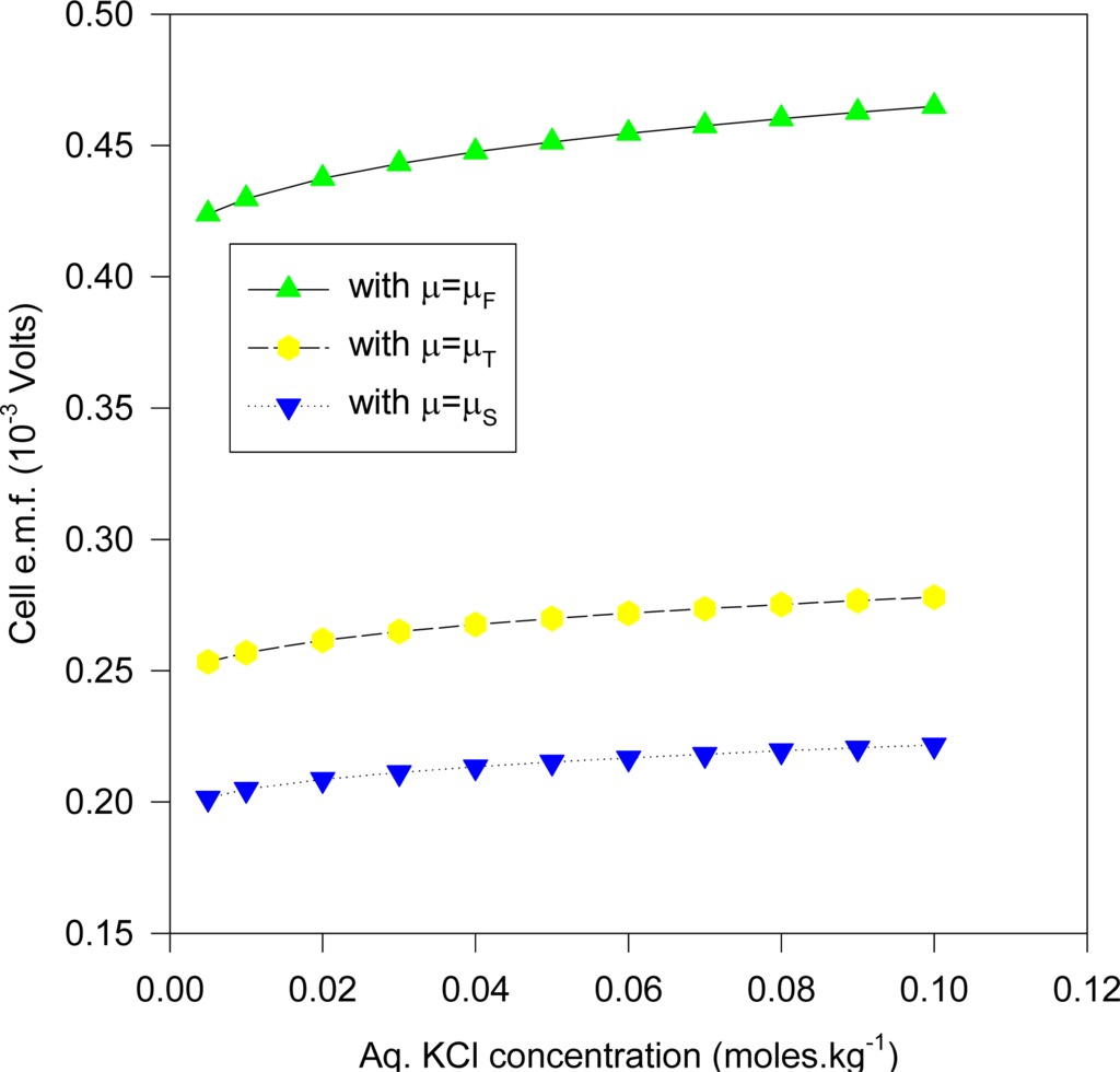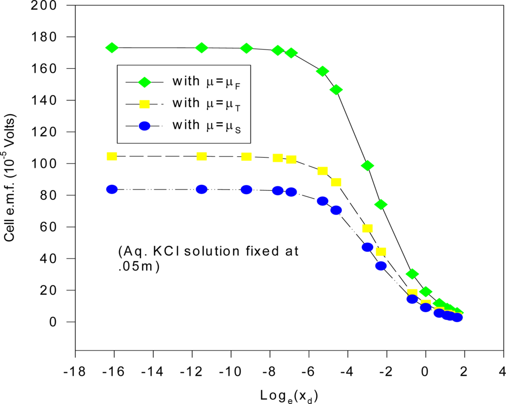 Cell e.m.f. computed for various μ and Helmholtz Inner layer distances Xd.