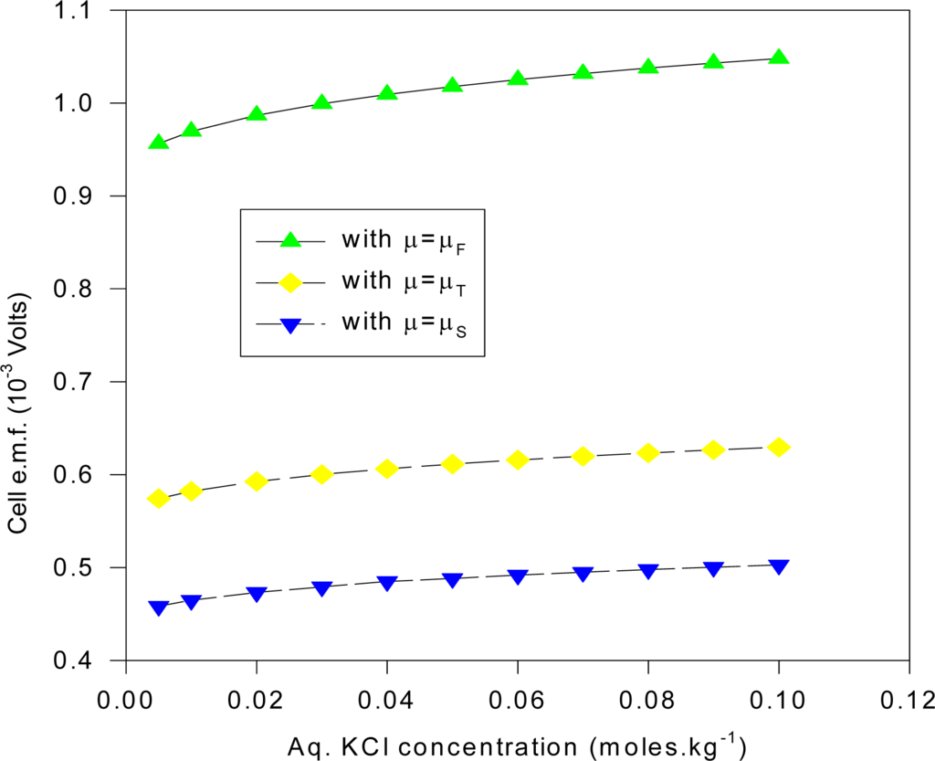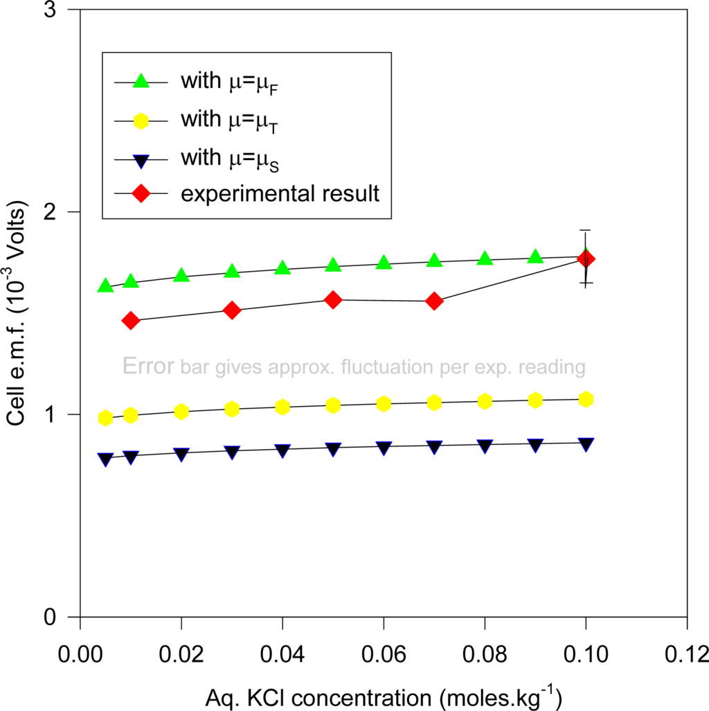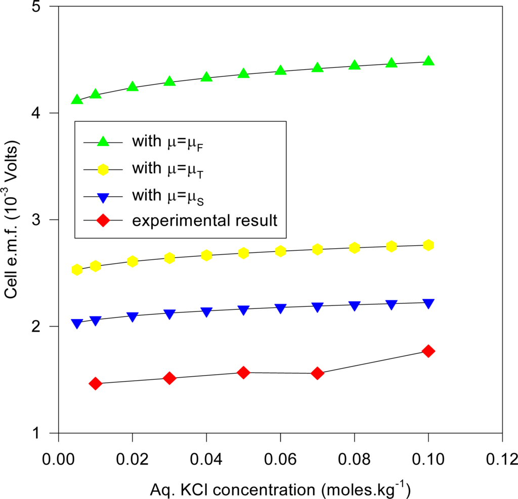 In order to test the regime of validity of Eø, the following lemmas (all of which have further applications to be elaborated) will be used. The results which the low resolution experiments obtained (despite the fact that these experiments could not determine unambiguously the predicted e.m.f. change of order of 0.1 mV with KCl concentration change of 0.1 m, compared to the actual cell e.m.f. values of ~ 1.5 mV over the entire concentration range) are in quantitative agreement to the theory developed from the lemmas. Each of the following lemmas will be applied to specific quantitative experiments. For what follows, the Greek letter symbols used follows the convention of the standard literature and this is sometimes unfortunate because of multiple usage of alphabets such as ε; the indicated subscripts or superscripts should leave unambiguous which quantity is implied.