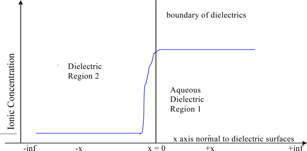 is the activity coefficient of the ion in the dielectric 2 at the interface; here the singularity is evident in terms of the activity coefficients, whereas the concentrations are continuous; an analogy would be as with electrostatic problems, where the voltage may be continuous but not the charge density. If we set β = 0 (implying continuity of activity coefficient), then the trivial solution m2 = ρ1m1/ρ2 ensues, implying (the absurd) conclusion that the c concentration of ions is invariant across the interface. The only approximation made here is the fixed value of the c ionic concentration at the interface; more sophisticated models might modify this concentration, as well as the value of γ2 at the interfacial boundary. If the permittivity of the phases follow ε1 > ε2 and c1 > c2, then the other choice of the boundary conditions is unphysical, since it would require