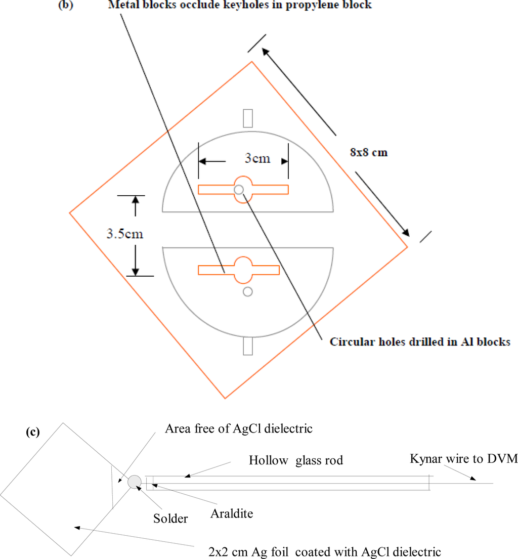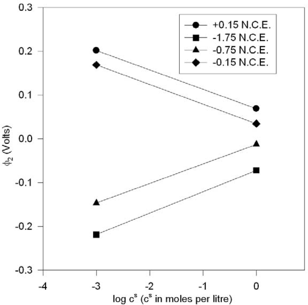 (with M = K+ for the system considered here), then the fundamental premise is contradicted if a nonzero and varying cell e.m.f. is registered for (1a) for different concentrations m. Furthermore, it would be beneficial if any of these cell potentials could be quantified by recourse to theory to map out the approximate regime of electrode size, solution strengths and the assumed potential of zero charge required in the theory where extraneous electrode effects become noticeable, so that in actual measurements, these predicted effects might be reduced or estimated by suitable choice of physical conditions.