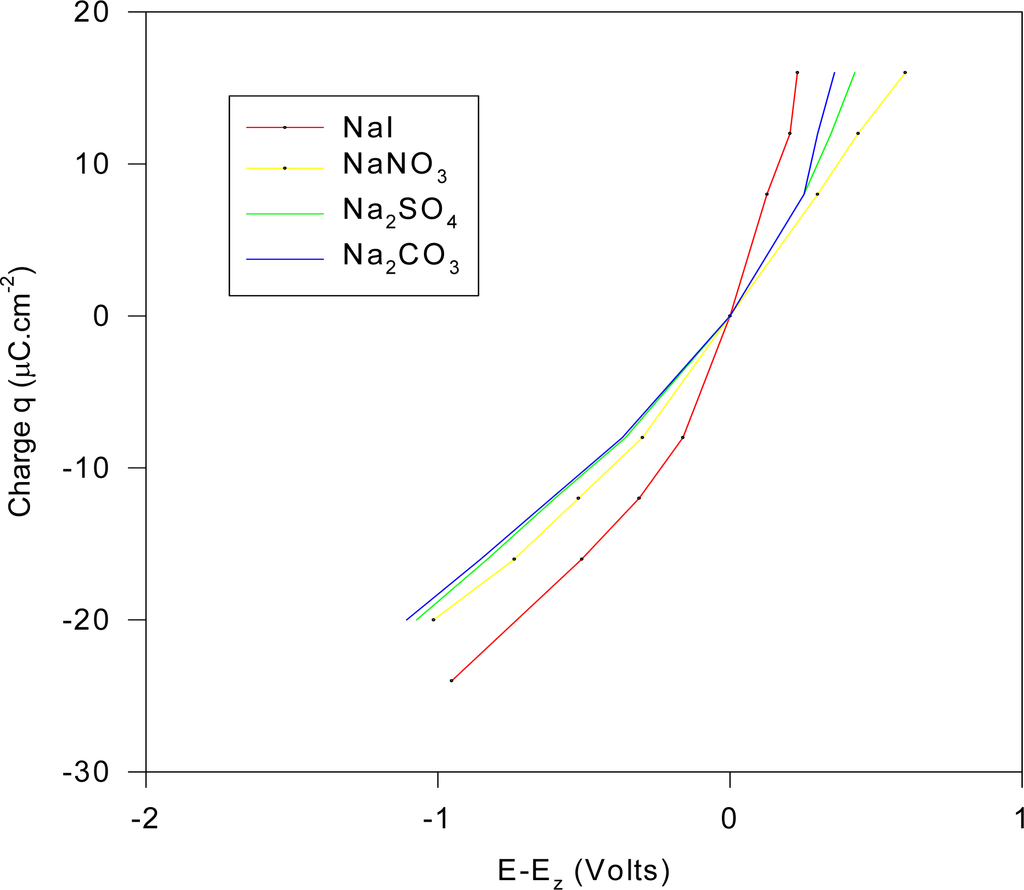 Proof: Suppose that the charge on the electrode is given by Q = Q(Δφ, n) where n are the physical variables pertaining to the electrode (permittivity, temperature etc.) whilst Δφ is the bulk interfacial potential written Δφ = φo–φl. Then dQ/dΔφ = Q′ (Δφ, n) = Cd, the differential capacitance. But Δφ = Δφ (c) for this electrode from the Nernst electrode potential equations (c are the variables for the Nernst equation). Thus, Q′ = Q′(c,n), which is a function of the physical variables apart from the electrode potential.