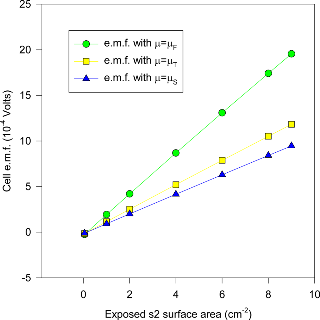 The fundamental premise in electrochemistry is that μ(e), the chemical potential of the electrons in the metallic phase substrate electrode is invariant during measurements [6–8] in systems at reversible equilibrium, and this μ(e) features in Eø, the standard potential of the electrode relative to some other electrode. Eø values are determined [8] from the limit of values of the cell potential (by extrapolation) as the ionic concentrations tend to a specified value, and thus is a constant for the particular cell in question but it is an added assumption to suppose constancy of Eø values when cells are concatenated [6] to determine activities for instance. If we should relax this constraint of constancy of μ(e) for the same concatenated cells, such as: