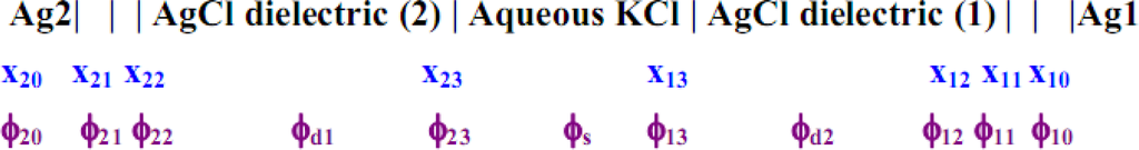 The two different (approximate) methods developed here are based on the assumption (Method A) that the concentration of the ion at the boundary of the two dielectric phases is that of the bulk for the phase with the higher bulk concentration, and the other method (Method B) is derived using the Born equation; m represent the bulk concentrations in molality units, ρ the densities, μo the standard potentials, γ the activities, and c the concentration in moles per unit volume (liter if numbers are quoted), and subscripts refer to the phase concerned. The assumption in Method A is inspired by the fact that the concentration of the active species is much lower in the electrode dielectric than it is in the aqueous layer, and that rapid exchange of the active ion by diffusive processes in chemical equilibrium would make the concentration near the surface close to the one for the bulk aqueous layer. The equations below apply at ‘low concentrations’ (~ 0.05 m), of the same magnitude used in the experiments reported here. Figure 2 is a representation of the system. The interface is at x = 0, with dielectrics 1 and 2 having coordinates +x and –x respectively.