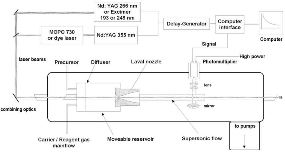 - Hansmann, B; Abel, B. Kinetics in cold Laval nozzle expansions: From atmospheric chemistry to oxidation of biomolecules in the gas phase. Chem. Phys. Chem 2007, 8, 343–356. [Google Scholar]