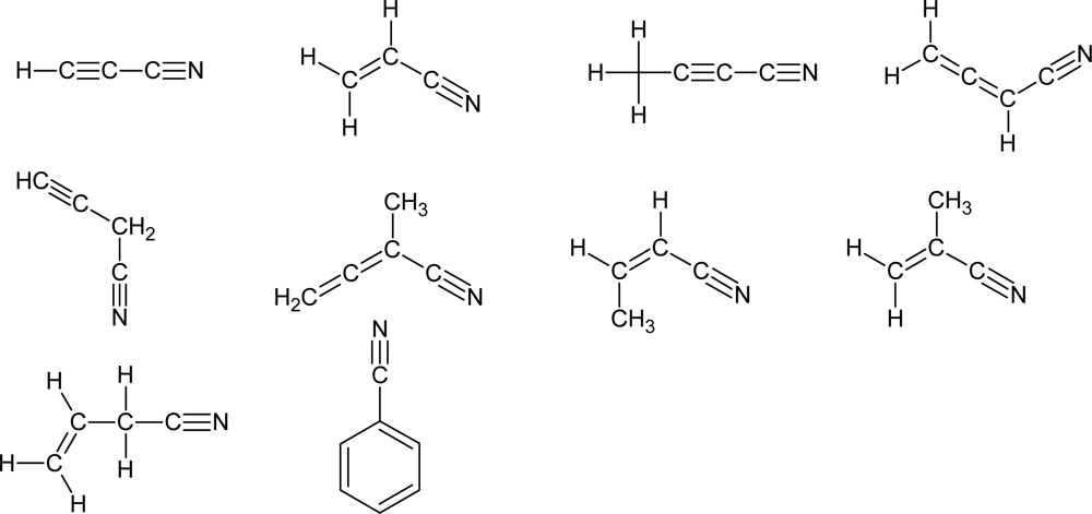 - Balucani, N; Asvany, O; Huang, LCL; Lee, YT; Kaiser, RI; Osamura, Y; Bettinger, HF. Formation of nitriles in the interstellar medium via reactions of cyano radicals, CN(X2Σ+), with unsaturated hydrocarbons. Astrophys. J 2000, 545, 892–906. [Google Scholar]
