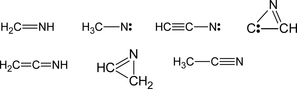| with C-N bonds | Aminoacids and Nucleobases | HCN, CH3CN, C2N2, HCCCN, CH2NH, C2H3CN |