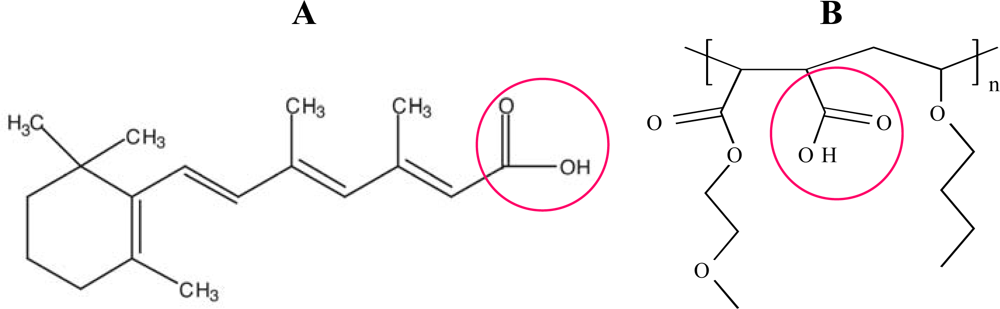 Carboxylic acid moieties confer amphiphilic behaviour to RA (A) and water solubility to VAM41 (B).