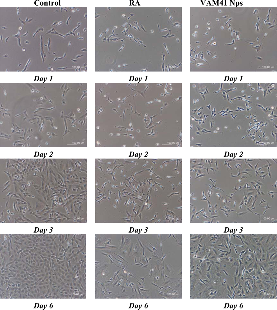 During the preparation of nanoparticles by Colloidal Coating, RA is subjected to pH variations, freezing and drying process. In order to examine whether the activity of RA was affected by incorporation in VAM41 nanoparticles, it was tested on SK-N-SH human neuroblastoma cell line that are known to undergo inhibition of proliferation and neuronal differentiation upon treatment with RA. SK-N-SH neuroblastoma cell line was chosen as a model to verify the possibility to differentiate towards a neuronal phenotype after exposure to bioactive principles.