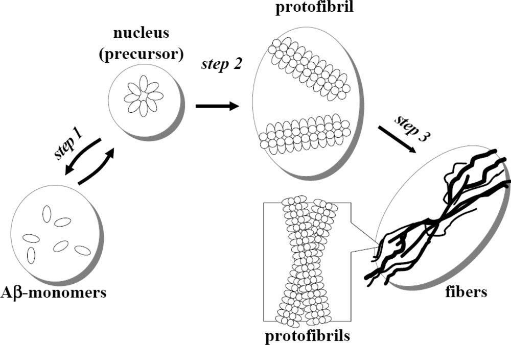A model of fibrillogenesis. In step 1, monomeric Aβ forms nuclei from which protofibrils emanate (step 2). These protofibrils give rise to fill-length fibers (step 3).