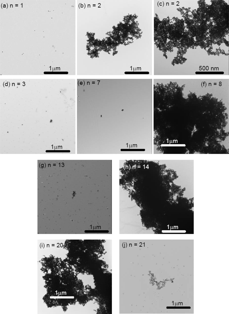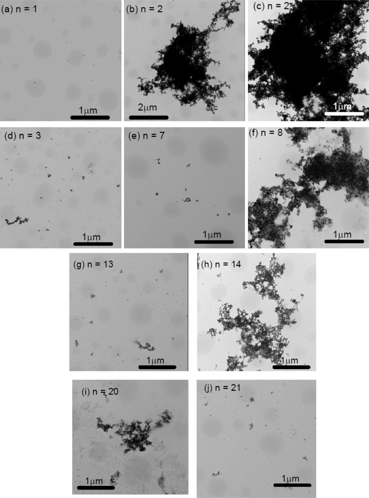 The TEM images of Aβ1–40 coated 20 nm gold colloids (a) n = 1 (pH 7), (b) n = 2 (pH 4), (c) n = 2 (pH 4), (d) n = 3 (pH 10), (e) n = 7 (pH 10), (f) n = 8 (pH 4), (g) n = 13 (pH 10), (h) n = 14 (pH 4), (i) n = 20 (pH 4), and (j) n = 21 (pH 10).