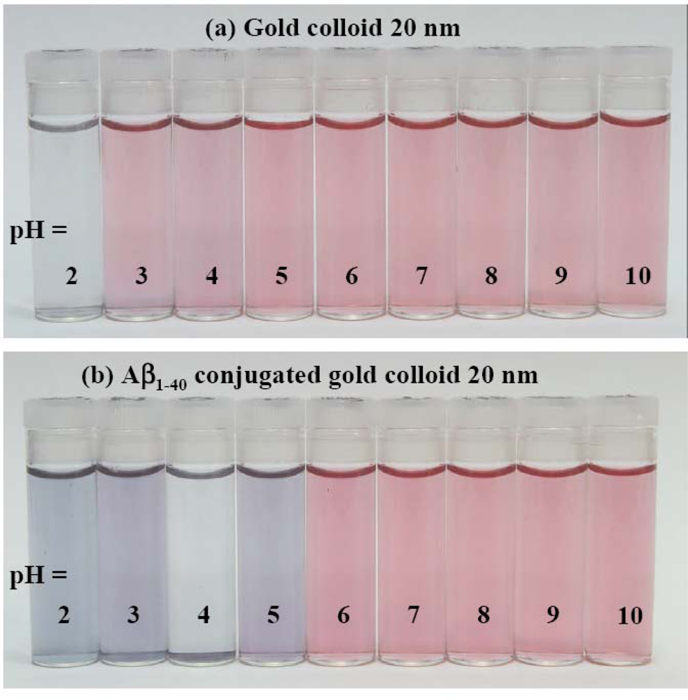 Visual evidence of the effect of pH on a colloidal gold nanoparticle solution. (a) The color of the solution of gold colloidal nanoparticle with size 20 nm. (b) The color of 20 nm colloidal gold nanoparticles coated with Aβ1–40.