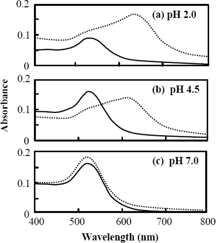Figure 2 provides visual colorimetric observation of the effect of pH on the bare gold nanoparticle or gold nanoparticles coated with Aβ1–40. The bare gold nanoparticle solutions in Figure 2a show almost no change from the original color except for pH 2, whereas the Aβ1–40 coated particles in Figure 2b display color variation around pH 5 or lower pHs.
