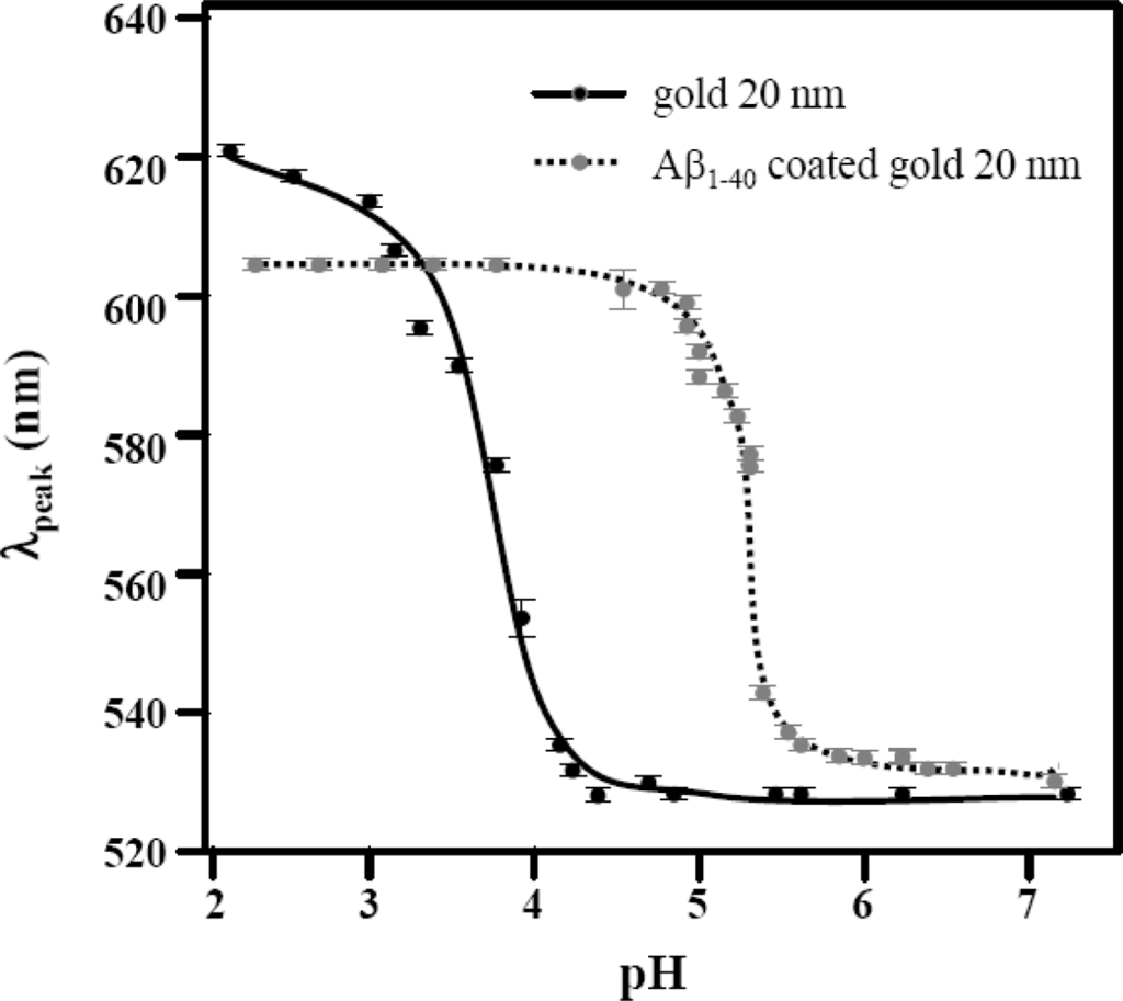 The pHo for 20 nm gold nanoparticles was determined to be 3.70 ± 0.07 and that for Aβ1–40 coated 20 nm gold colloid was 5.33 ± 0.01, which is close to the value of pI = 5.2. It is generally accepted that a protein conjugation onto the gold colloidal surface is observed c.a. 0.5 pH unit above pI value [40]. The values of dpH for 20 nm gold colloid and Aβ1–40 coated 20 nm gold colloid were 0.24 ± 0.07 and 0.08 ± 0.01, respectively. Since dpH is inversely proportional to λ peak(1), the first derivative of the λpeak(pH), the smaller value in dpH indicates the higher λpeak(1). The high λpeak(1) of Aβ1–40 must imply that this sequence sensitively responds to the acidic condition and transforms conformation. Considering that a net charge of Aβ1–40 is none, higher responsiveness to pH change was surprising. We suspect the negatively charged segments reside in hydrophilic tail (i.e., 1st, 3rd, 7th, 11th sequences - aspartic acid or glutamine) are responsible for interacting with acid leading to the unfolding of the conformation. The unfolded protein must be playing a key role to intermediate the gold colloids to form an aggregate. While the peak position at the higher pHs, λ min, were very similar for both 20 nm gold colloid and Aβ1–40 coated 20 nm gold colloid (526 ± 4 nm and 531 ± 1 nm), the peak position at the lower pH, λ max, was longer for 20 nm gold colloid (615 ± 6 nm) compared to that of Aβ1–40 coated 20 nm gold colloid (597 ± 1 nm).