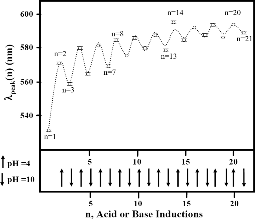 where n indicates the operation of pH change. The n = 1 indicates the starting pH which is around pH 7. Odd numbers of n (n = 3, 5, 7,…) indicate an operation of acid addition, decreasing the pH of solution to pH 4, whereas even numbers of n (n = 2, 4, 6,…) show an operation of base addition to increase the pH of solution to pH 10. (The parameters A, B, C, D, and E were extracted and are shown in Table 1.) Equation 3 was devised to reproduce the spectral shift (the first term) and repetition change (the second term). In this equation an initial peak position at neutral pH (i.e., λpeak(1)) is given by A – D, and the parameters B and C show the average wave peak position shift as pH varies between 4 and 10. In the second term, the parameter D and E imply amplitude and damping factor for the repetitive event, and the sine function was used to indicate peak up and down upon addition of acid and base. The values calculated by Equation 3 are effective only for each n value, not the values in between each n. Thus, the dotted line shown in Figure 5 is given only for the purpose of clarifying the repetitive trend.