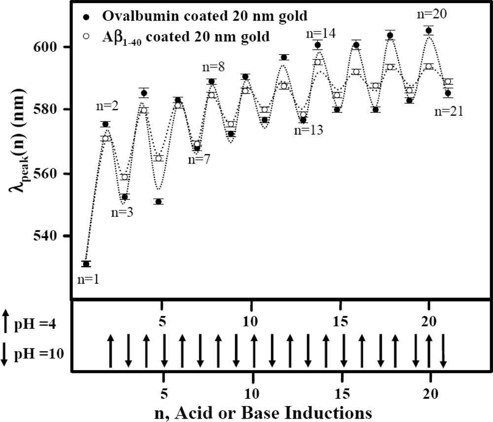 The wave peak of each acid or base addition operation, λpeak(n), is represented by using Equation 3. (The parameters A, B, C, D, and E are shown in Table 1.) While the values of λ (1) were around 530 nm for both cases, the peak position started differ even at n = 3. Parameter B is a measure of the average peak wavelength at each induction, which converges at n = ∞. Therefore, a larger value of B means that the spectrum converges to a structure stabilized under acidic conditions by exhibiting more red shift at a relatively early induction number (a small value of n). The parameter C implies an induction number dependence of parameter B. Our result indicated that both cases show similar B and C parameters. The pre-exponential factor D represents the half value of the maximum difference of peak wavelength between pH 4 and pH 10 (i.e., the difference between λpeak(pH = 4) and λpeak(pH = 10) is given by 2 × D nm). The D parameter for ovalbumin is larger than that of Aβ1–40, and this is consistent with the larger peak value shift in ovalbumin. Lastly, the parameter E exhibits how fast the oscillation character dies down (i.e., a damping index). The parameter E has most significant difference between ovalbumin and Aβ1–40 among all parameters. A damping factor of amplitudes was larger in Aβ1–40 coated gold colloid by a factor of approximately 3.5. This indicates that the reproducibility of the structure over the colloid surface is higher for ovalbumin proteins. It can imply that the segments of ovalbumin which are responsible for the reversible structure are more resistant to the acid. This may also mean that the conformation of Aβ1–40 located on the gold colloid surface was more affected by the surface field (most likely electrostatic interaction) resulting in less freedom for Aβ1–40 to repeat the conformational change. From the fact that the entire peak is shifting toward a longer wavelength from the original starting value, protein may be unfolded (or denatured) by acid, and Aβ1–40 can be said to be denatured more easily by the acid.