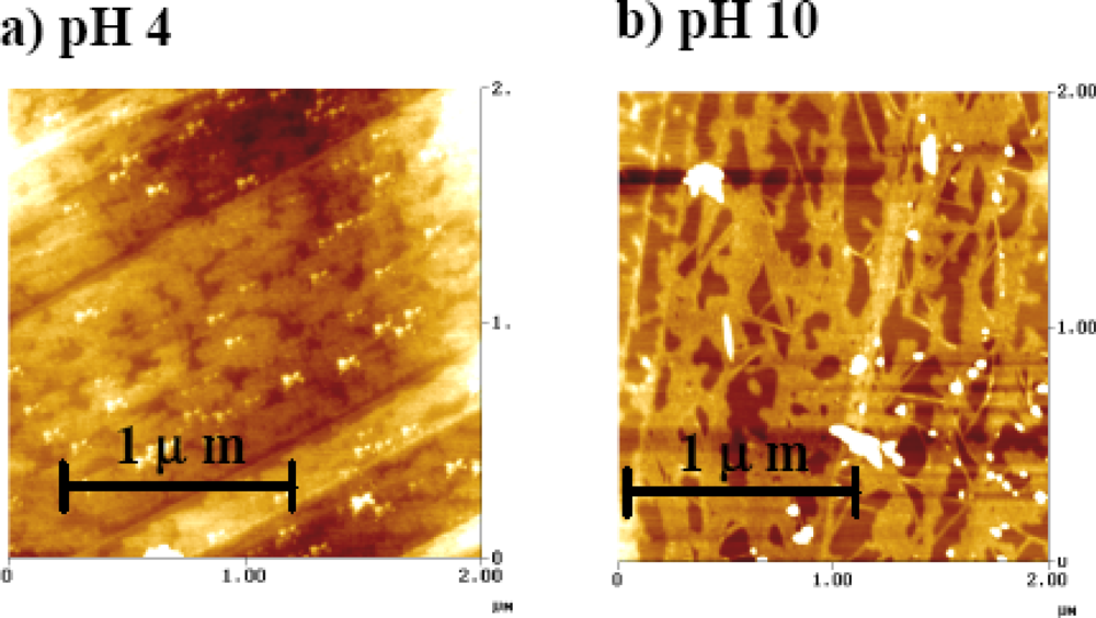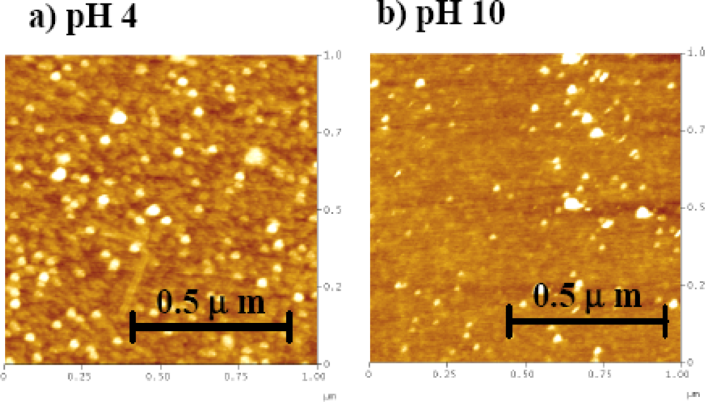 We also collected the AFM images on a mica surface for the solutions prepared at pH 4 and pH 10 (See Figure 8). At pH 4, we were able to observe a film of granular morphology with limited fiber-like structures of the protein with gold dispersed along the network. However, this protein/gold granular morphology was not clearly observed for pH 10. For both pH 4 and pH 10 conditions, the average particle size of the gold colloids was 30 nm and we did not find strong evidence of aggregation of the gold colloids. The mica surface provided a high sticking coefficient for the solution, so the original molecule arrangement in the solution may remain over the mica surface better than over the graphite surface.