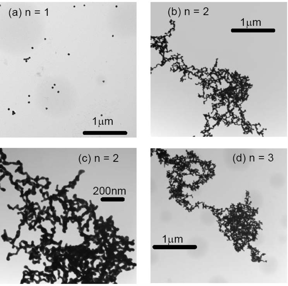 The TEM images of 20 nm gold colloids (a) n = 1 (pH 7), (b) n = 2 (pH 4), (c) n = 2 (pH 4), and (d) n = 3 (pH10).