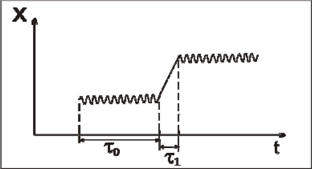 Let τ0 be the characteristic time for small oscillations of a molecule near its temporary equilibrium position. Often, this time is called as the residence time []. The characteristic time τ1, during which a molecule displaces from an initial vibration state to another one, will be called as the transition time. The character of small oscillations in supercooled water is close to that in the hexagonal ice, where each molecule is connected with its nearest neighbors by four H-bonds. However, the duration of τ0 in them is different: τ0 = ∞ in the hexagonal ice and it takes a finite value for supercooled and normal water. One can say that the thermal motion in water has a crystal-like character if τ0 ≫ τ1. This situation is illustrated in Figure 2.