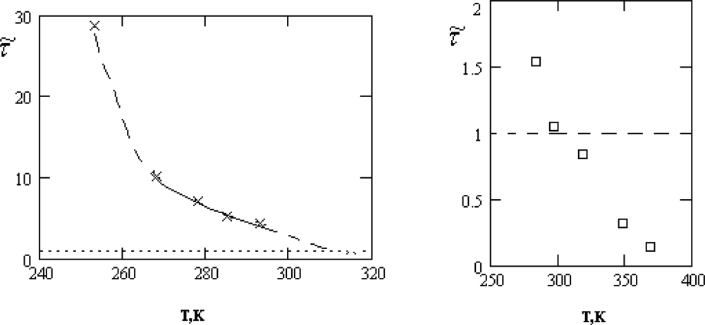 The temperature dependence of the ratio τ͂ = τ0/τ1: crosses correspond to the experimental data [], squares – to [] (the value τ0 is determined with the help of Equation (2)).