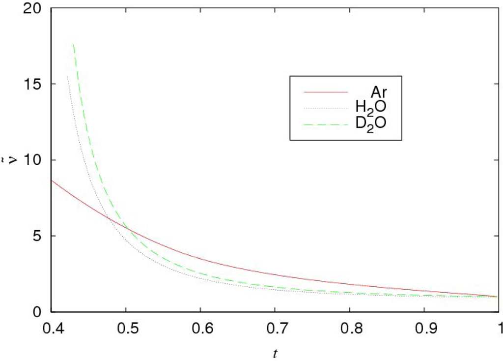 For separating contributions of different physical nature, let us compare the behavior of the normalized shear viscosities for water and argon in the manner of the principle of corresponding states [–]. The normalized values of the kinematic shear viscosities are determined as: