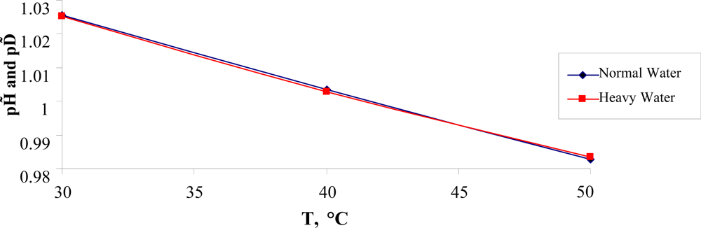 is invariant of temperature and could be used in further research. Here it is essential to note that heavy water self-ionizes less than normal water, owing to a slightly stronger hydrogen bond.