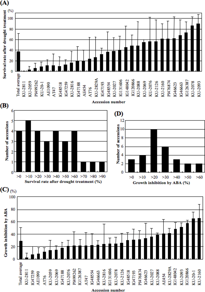 It also varied widely from 2.0 ± 7.3% (KU-2811) to 65.4 ± 22.4% (KU-2160) in the 30 Ae. tauschii accessions (Figure. 1C, 1D). The average ABA sensitivity was 29.1 ± 21.1%.