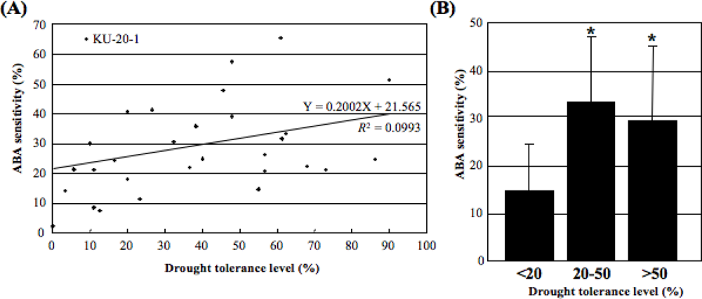 Correlation between drought tolerance and ABA sensitivity in Ae. tauschii.(A) Scatter plot showing drought tolerance and ABA sensitivity in 30 Ae. tauschii accessions. (B) Comparison of ABA sensitivity for three Ae. tauschii groups (excluding KU-20-1, which had a distinct level of drought tolerance). Student’s t-test was used to test for statistical significance (*P < 0.05) between the different categories of drought tolerance.