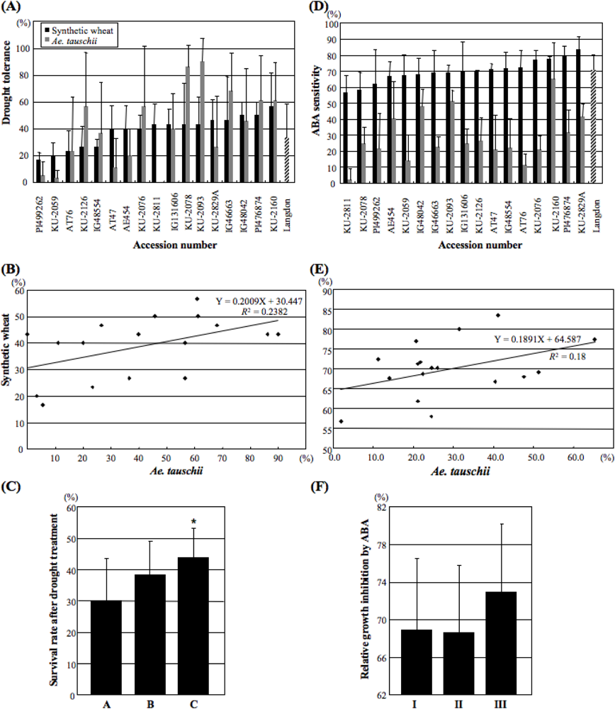 A wild wheat progenitor, Ae. tauschii, had large genetic variation in drought tolerance and exogenous ABA sensitivity. The level of drought tolerance was at least partly related to ABA sensitivity. Similarly, synthetic wheats derived from hybrids between Langdon and Ae. tauschii accessions showed wide variations in drought tolerance and ABA sensitivity, although no significant correlation between the synthetic wheats and their parental Ae. tauschii accessions was observed. However, synthetic wheats derived from the parental Ae. tauschii accessions with high drought tolerance were significantly more tolerant to drought stress than those from the drought-sensitive accessions. Therefore, Ae. tauschii accessions with high levels of abiotic stress tolerance are expected to be useful resources to breed abiotic stress-tolerant cultivars of bread wheat. Allohexaploidization altered the expression profile of abiotic stress-responsive genes. Previous studies on the transcriptome in allopolyploids used a limited number of artificially produced lines. Therefore, further studies, including detailed systematic analyses, will be needed to explain the molecular basis of modifications of D-genome variation patterns following allopolyploidization.
