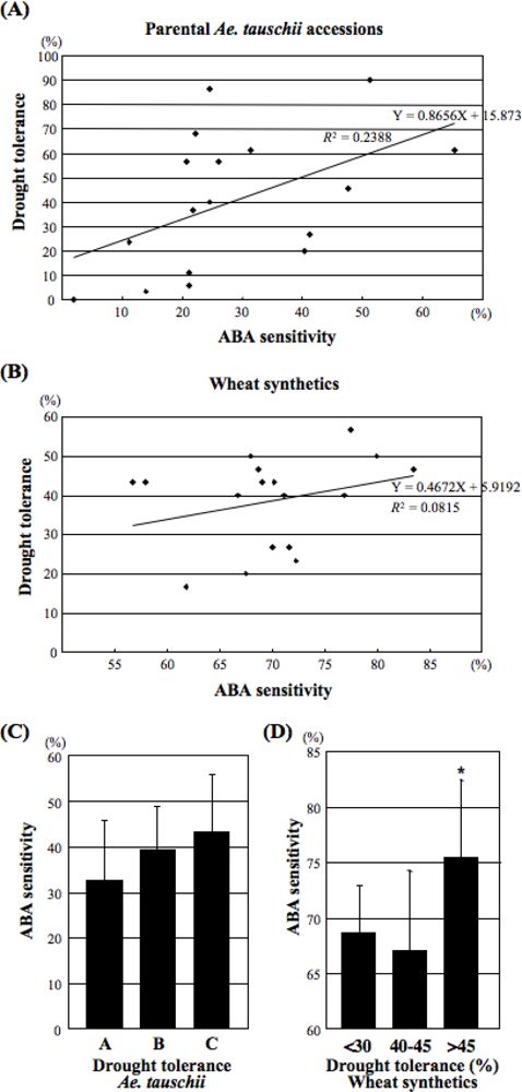 The relationship between the level of drought tolerance level and ABA sensitivity was studied in the hexaploid genetic background. Correlation (R) values between drought tolerance and ABA sensitivity were 0.49 (P=0.122) in the parental Ae. tauschii accessions and 0.29 (P=0.26) in the synthetic wheats (Figures 4A, 4B). No significance was observed between the drought tolerance level and ABA sensitivity at either the diploid or hexaploid level. The range of variation in the level of drought tolerance and ABA sensitivity was narrower in the synthetic lines than in the parental Ae. tauschii accessions. The ABA sensitivity of the 17 synthetic wheat lines was also compared with the level of drought tolerance of both parental Ae. tauschii accessions and synthetic lines. No significant difference in ABA sensitivity was observed among the three groups based on the drought tolerance of the parental Ae. tauschii accessions (Figure 4C). The highly drought-tolerant group with more than 45% tolerance in the synthetic wheats was significantly more sensitive to exogenous ABA treatment than the other groups (Figure 4D).