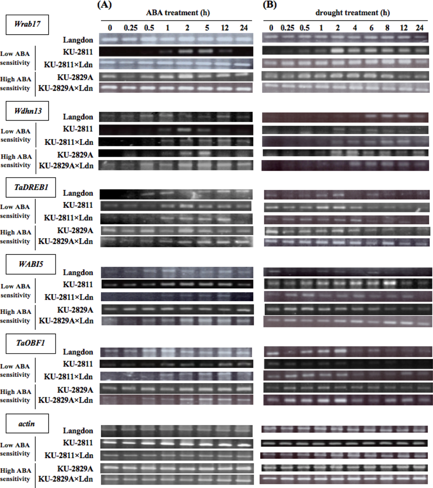 Two Cor/Lea genes, Wrab17 and Wdhn13, are responsive to exogenous ABA and drought stress treatment [–]. Expression levels of the Actin gene used as an internal control were not changed by stress treatment in any of the accessions and lines examined. Wrab17 transcript accumulation was clearly induced by ABA and drought treatment in both Ae. tauschii accessions (Figure 5A). KU-2829A accumulated Wrab17 transcripts more abundantly than KU-2811 under both stress conditions. In Langdon and the two synthetic wheats, induction of Wrab17 expression was not clear, and the accumulation was highly abundant. No significant difference in expression pattern was observed for the ABA and drought treatments among Langdon and the two synthetic wheats.