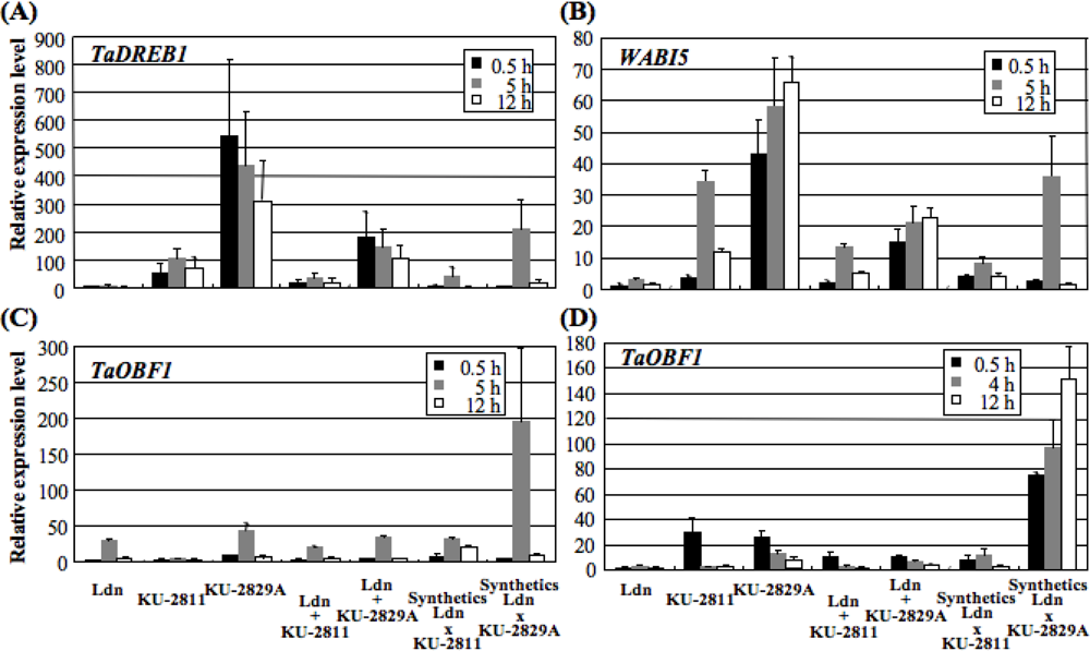 Expression of TaDREB1, WABI5 and TaOBF1 was responsive to exogenous ABA treatment in Langdon and the parental Ae. tauschii accessions (Figure 5A). KU-2829A more abundantly accumulated TaDREB1 and WABI5 transcripts than KU-2811 after ABA treatment. TaDREB1 and WABI5 transcript levels were higher in the KU-2829A-derived synthetic line than in the KU-2811-derived line. Expression of the three transcription factor genes was responsive to drought stress treatment, but the induction was more rapid than after ABA treatment (Figure 5B). The drought-responsive expression patterns of TaDREB1, WABI5 and TaOBF1 in both synthetics seemed to correspond to the sum of those of Langdon and the parental Ae. tauschii accessions.