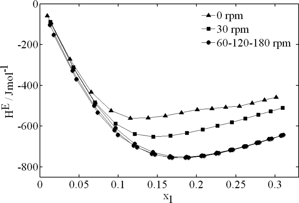 A constant stirring velocity keeps the baseline at a constant level that will be able to be modified after the injection. The ideal stirring process is the one which assures the homogeneity of the mixture at every instant, not favouring the evaporation or increasing the signal noise. In order to analyze the effect that the stirring velocity has on the excess molar enthalpies, the ethanol + water system was analyzed. The measures consisted in 15 injection pulses of ethanol into 1 mL of water, each injection pulse during 100 s and a flow of 1 μL/s. Figure 5 shows final values of the excess enthalpy for different stirring velocities (0, 30, 60, 120 and 180 rpm).