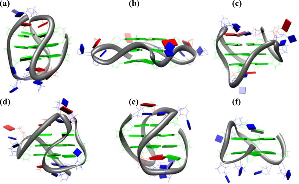 (a) NMR structure of the anti-parallel G-quadruplex formed by the d[AG3(T2AG3)3] sequence in Na+ solution (pdb code: 143D). (b) Crystal structure of the parallel G-quadruplex formed by the d[AG3(T2AG3)3] sequence in the presence of K+ (pdb code:1KF1). (c) NMR structure of the G-quadruplex formed by the d[TAG3(T2AG3)3] sequence (hybrid-1) in K+ solution (pdb code: 2JSM). (d) NMR structure of the G-quadruplex formed by the d[TAG3(T2AG3)3TT] sequence (hybrid -2) in K+ solution (pdb code: 2JSL). (e) NMR structure of the antiparallel G-quadruplex formed by the d[G3(T2AG3)3T] sequence in K+ solution (pdb code: 2KF8). (f) NMR structure of the thrombin binding aptamer (TBA) (pdb code: 1RDE).